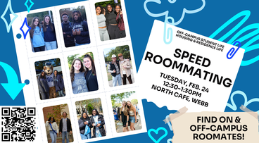 Speed Roommating (2/24)Make some connections in a low-pressure environment as you start your search for potential roommates! Tuesday, Feb. 2412:30-1:30pmNorth Cafe, Webb CenterRegister here!