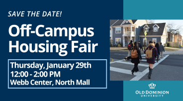 Start your housing search at the Off-Campus Housing Fair on Thursday, January 29th! Stop by and speak with representatives from properties located close to campus about their off-campus living options! Questions? Email: offcampuslife@odu.edu